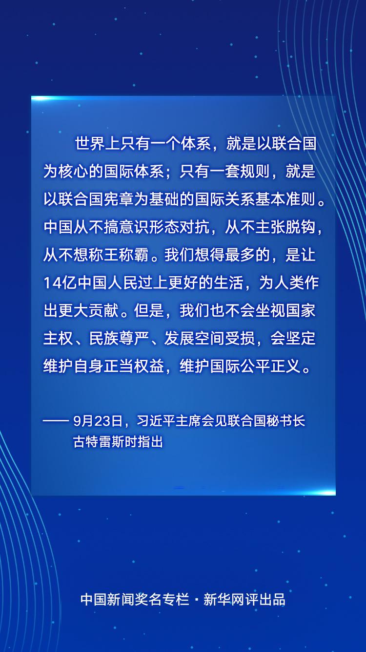 “世界上只有一個體系,就是以聯(lián)合國為核心的國際體系;只有一套規(guī)則,就是以聯(lián)合國憲章為基礎(chǔ)的國際關(guān)系基本準則!闭驹谛碌臍v史起點上,重溫聯(lián)合國的初心使命,重申對多邊主義的堅定支持,重申對聯(lián)合國憲章的莊嚴承諾,匯聚起構(gòu)建人類命運共同體的磅礴之力,世界定將擁有更加光明的未來。(文字:李介 海報:樊珊珊)
