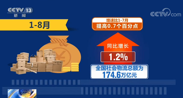1—8月,全國(guó)社會(huì)物流總額為174.6萬億元,同比增長(zhǎng)1.2%,增速比1—7月提高0.7個(gè)百分點(diǎn)。