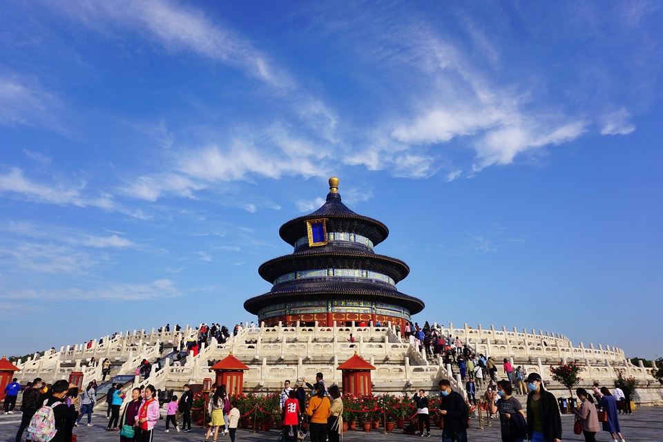 2020年10月3日,北京秋高氣爽,天壇公園祈年殿在藍天白云映襯下更顯壯觀。