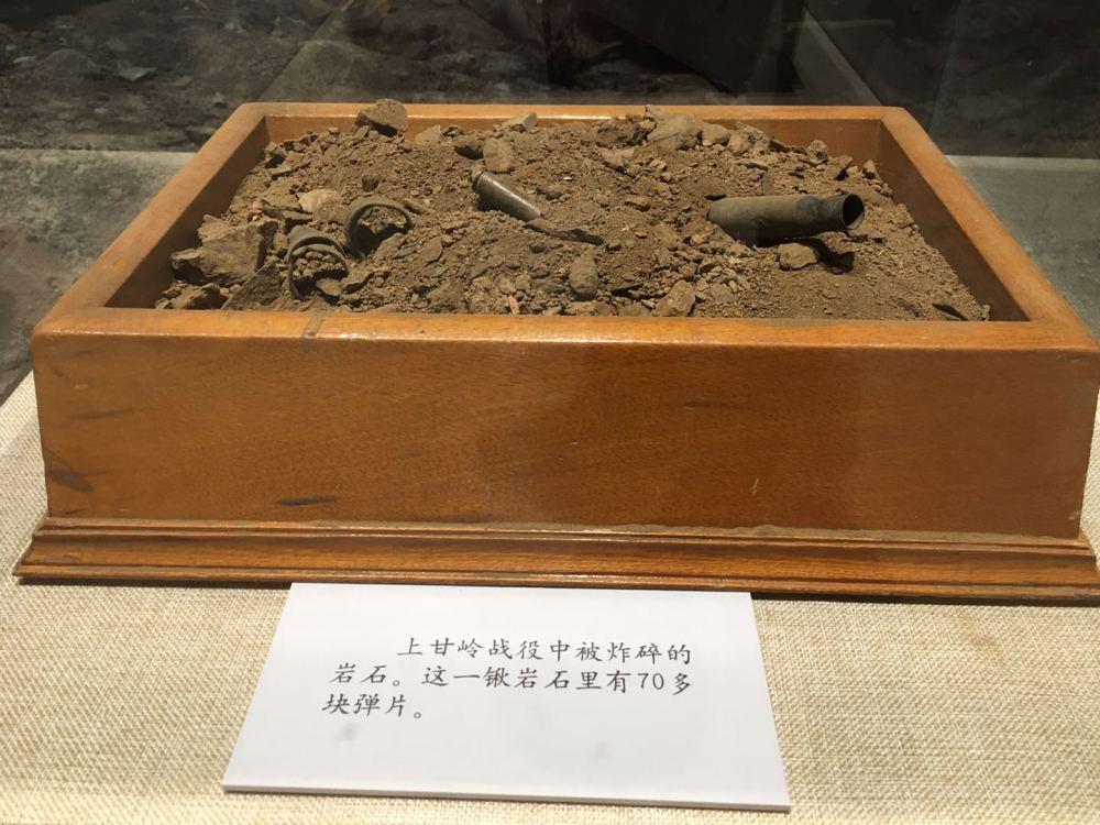 在軍博的主題展覽“血戰(zhàn)上甘嶺”展區(qū),幾件戰(zhàn)場(chǎng)實(shí)物似乎還能讓人聞到當(dāng)年的殘酷硝煙:一截嵌滿彈片的枯樹干,一堆摻雜著彈片的碎石焦土,被炸斷50多處的200多米電話線……
