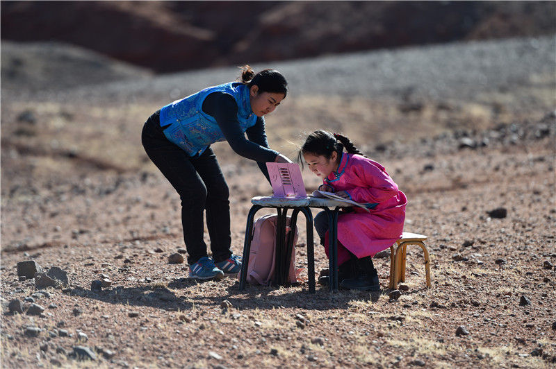 9歲的策耿(右)在家附近的戈壁上網(wǎng)課(4月1日攝)。策耿是內(nèi)蒙古自治區(qū)阿拉善左旗蒙古族學校四年級學生。由于疫情防控,策耿父母長期雇傭的一名外省羊倌沒能回到當?shù),一家人只好回到阿拉善左旗烏力吉蘇木溫都爾毛道嘎查的牧區(qū)家中照看羊群。期間,策耿一邊協(xié)助父母,一邊上網(wǎng)課。新華社記者 劉磊 攝