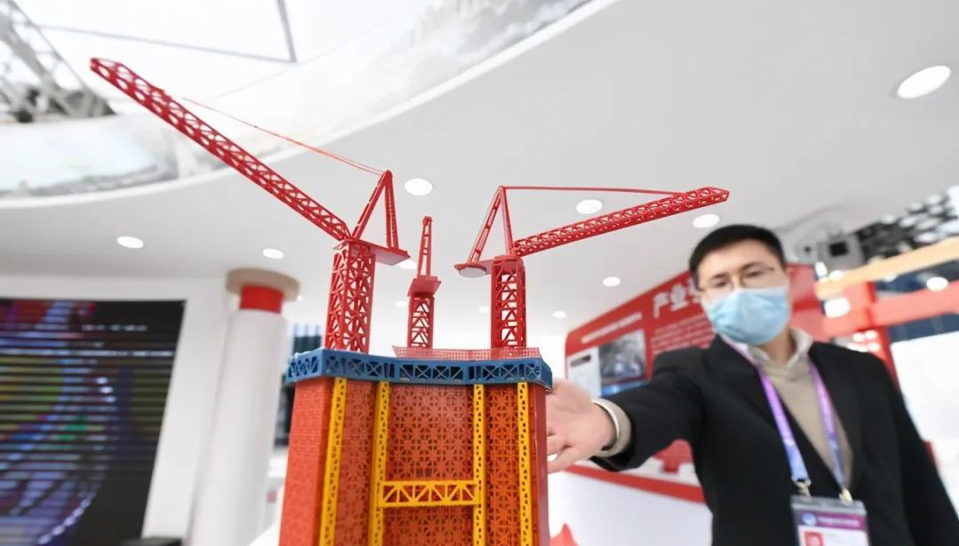 △第三屆進(jìn)博會(huì)上展出的“空中造樓機(jī)”不僅較傳統(tǒng)施工裝備更加安全智能,還可縮短20%的工期。