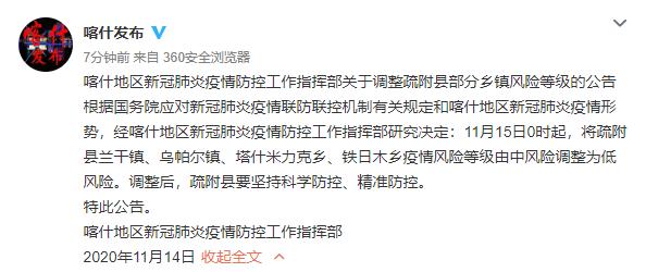 根據(jù)國務(wù)院應(yīng)對新冠肺炎疫情聯(lián)防聯(lián)控機(jī)制有關(guān)規(guī)定和喀什地區(qū)新冠肺炎疫情形勢,經(jīng)喀什地區(qū)新冠肺炎疫情防控工作指揮部研究決定:11月15日0時起,將疏附縣蘭干鎮(zhèn)、烏帕爾鎮(zhèn)、塔什米力克鄉(xiāng)、鐵日木鄉(xiāng)疫情風(fēng)險等級由中風(fēng)險調(diào)整為低風(fēng)險。調(diào)整后,疏附縣要堅持科學(xué)防控、精準(zhǔn)防控。