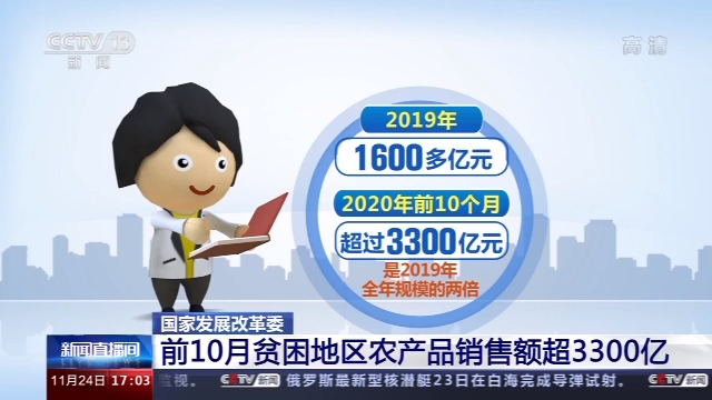 在24日的國(guó)新辦新聞發(fā)布會(huì)上,國(guó)家發(fā)展改革委、上海市合作交流辦、湖北省發(fā)展改革委、國(guó)鐵集團(tuán)有關(guān)負(fù)責(zé)人介紹了消費(fèi)扶貧助力打贏脫貧攻堅(jiān)戰(zhàn)的有關(guān)情況。數(shù)據(jù)顯示,今年前10個(gè)月,累計(jì)直接采購(gòu)或幫助銷(xiāo)售貧困地區(qū)特色農(nóng)產(chǎn)品超過(guò)3300億元,是2019年全年規(guī)模的兩倍。