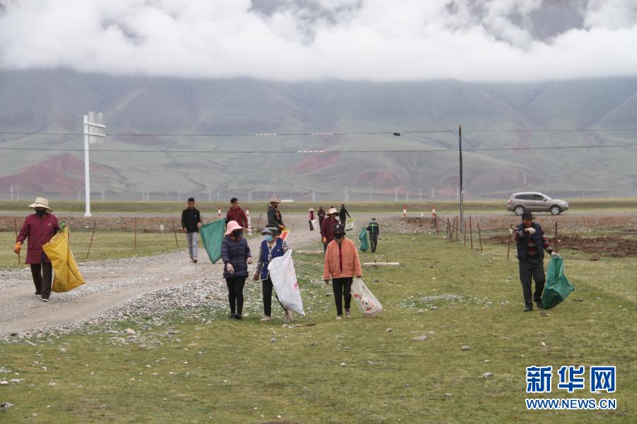 三江源國家公園治多生態(tài)環(huán)保協(xié)會(huì)的志愿者在撿拾垃圾(6月15日攝)。新華社發(fā)