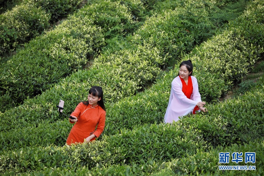 4月30日,網(wǎng)絡(luò)主播毛華艷(右)在貴州省余慶縣白泥鎮(zhèn)春景村郊外的茶園直播,助推山區(qū)茶葉銷(xiāo)售。新華社記者 劉續(xù) 攝