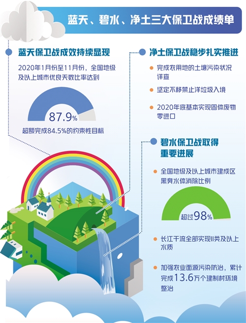 在近日召開的國新辦新聞發(fā)布會上,生態(tài)環(huán)境部介紹,“十三五”規(guī)劃綱要確定的9項約束性指標和污染防治攻堅戰(zhàn)階段性目標任務(wù)超額圓滿完成,藍天、碧水、凈土三大保衛(wèi)戰(zhàn)取得重要成效,生態(tài)保護和修復(fù)持續(xù)推進,應(yīng)對氣候變化工作取得積極進展,已經(jīng)提前超額完成對外承諾的2020年目標。