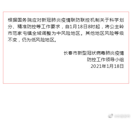 據(jù)長春發(fā)布官博消息,根據(jù)國務(wù)院應(yīng)對新冠肺炎疫情聯(lián)防聯(lián)控機制關(guān)于科學(xué)劃分、精準(zhǔn)防控等工作要求,自1月18日8時起,將公主嶺市范家屯鎮(zhèn)全域調(diào)整為中風(fēng)險地區(qū)。其他地區(qū)風(fēng)險等級不變,仍為低風(fēng)險地區(qū)。