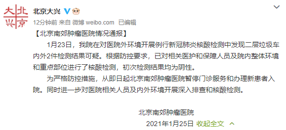 據(jù)“北京大興”官方微博消息,1月23日,北京南郊腫瘤醫(yī)院在對(duì)醫(yī)院外環(huán)境開(kāi)展例行新冠肺炎核酸檢測(cè)中發(fā)現(xiàn)二層垃圾車內(nèi)外2件檢測(cè)結(jié)果可疑。根據(jù)防控要求,已對(duì)相關(guān)醫(yī)護(hù)和保障人員及院內(nèi)整體環(huán)境和重點(diǎn)部位進(jìn)行了核酸檢測(cè),初次檢測(cè)結(jié)果均為陰性。