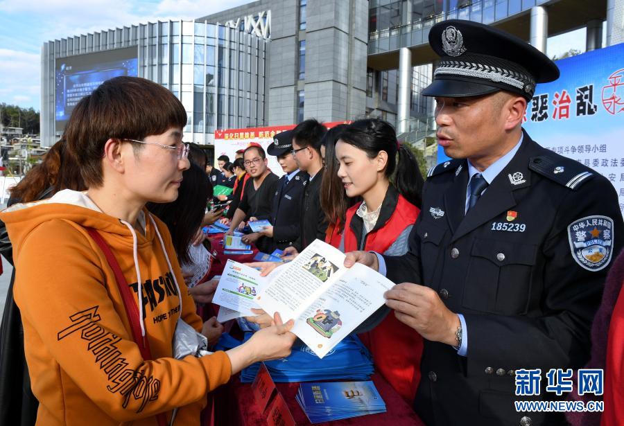 福建省福州市永泰縣公安干警在掃黑除惡專項(xiàng)斗爭宣傳活動(dòng)上向群眾介紹專項(xiàng)斗爭成果(2020年1月6日攝)。新華社記者 張國俊 攝