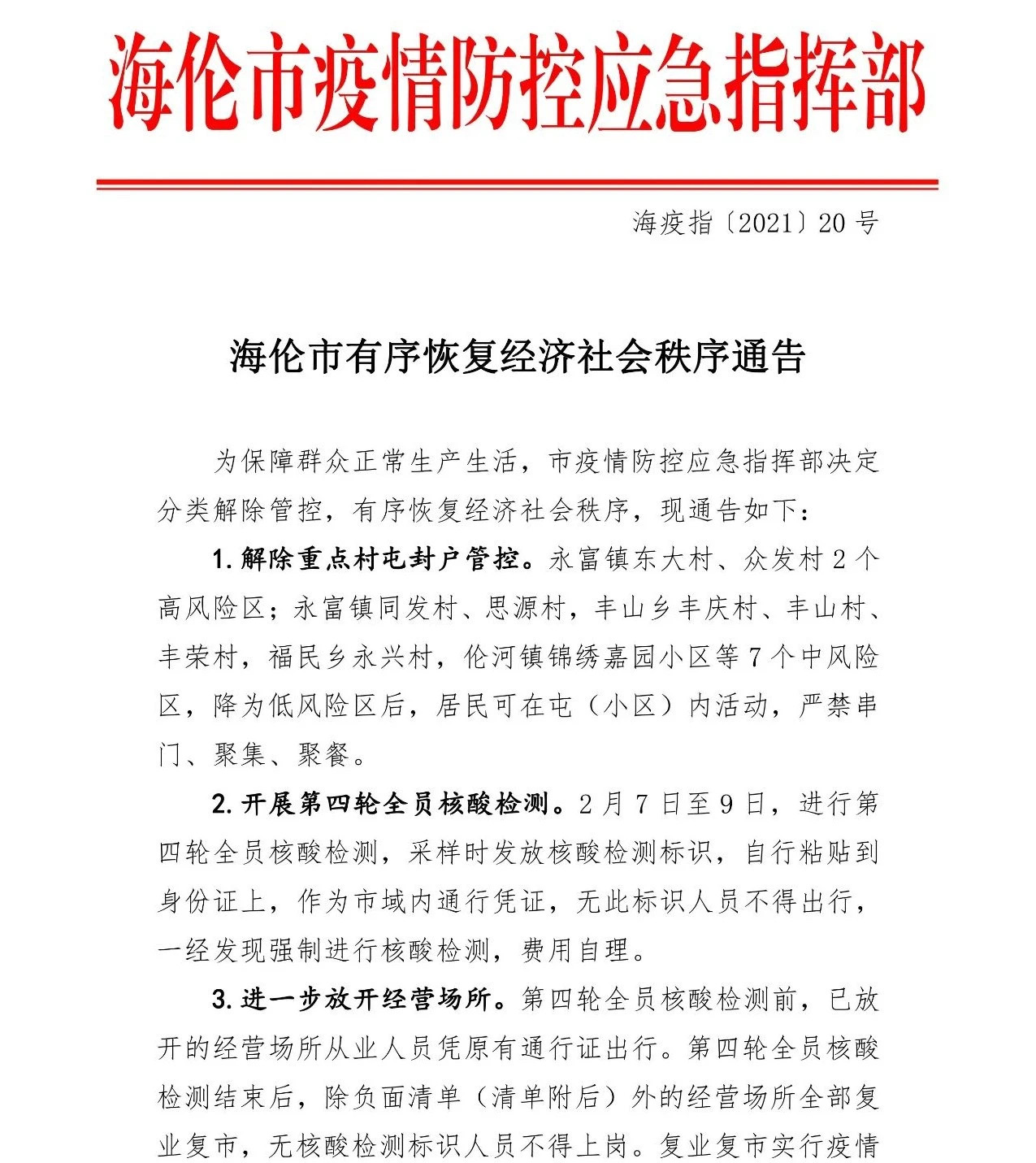 2月6日,黑龍江綏化海倫市疫情防控應(yīng)急指揮部發(fā)布公告,為保障群眾正常生產(chǎn)生活,市疫情防控應(yīng)急指揮部決定分類解除管控,有序恢復(fù)經(jīng)濟(jì)社會秩序,現(xiàn)通告如下∶