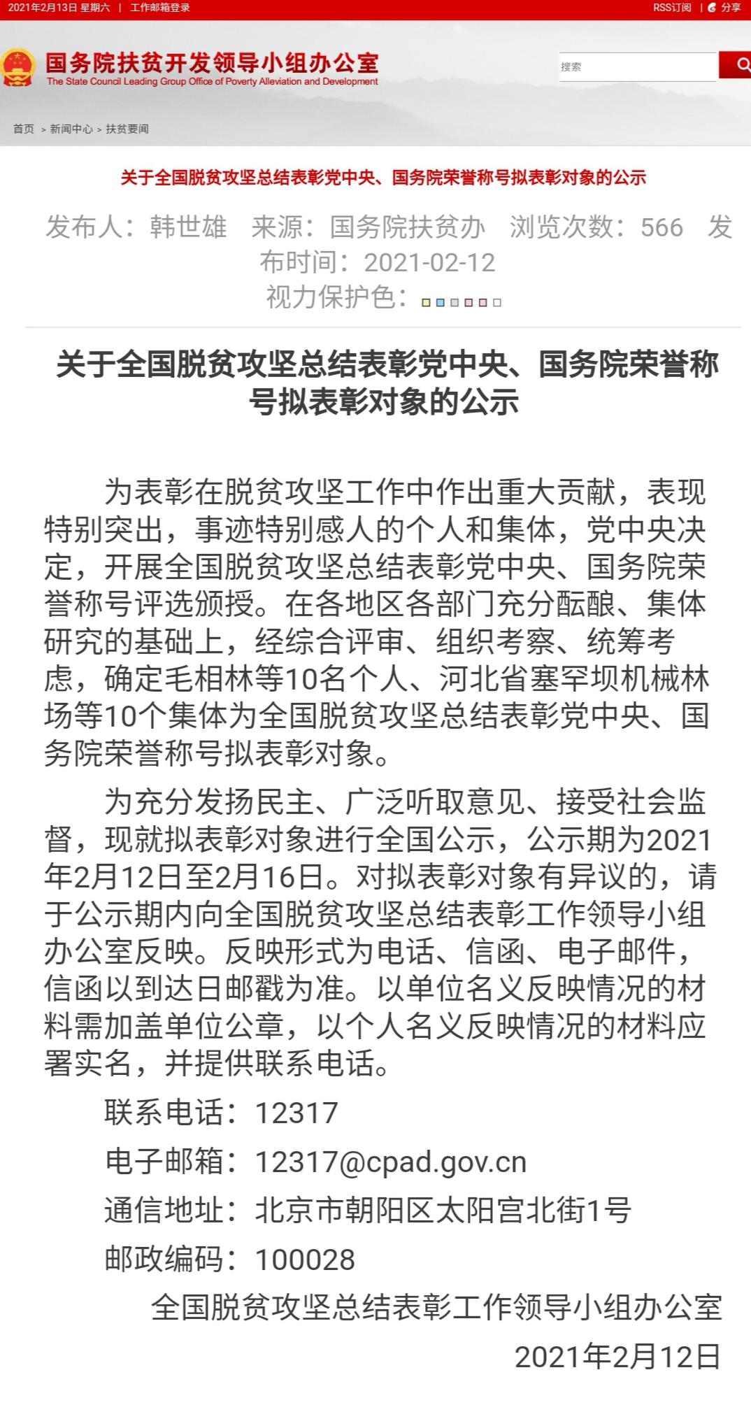 為充分發(fā)揚(yáng)民主、廣泛聽取意見、接受社會(huì)監(jiān)督,現(xiàn)就擬表彰對象進(jìn)行全國公示,公示期為2021年2月12日至2月16日。對擬表彰對象有異議的,請于公示期內(nèi)向全國脫貧攻堅(jiān)總結(jié)表彰工作領(lǐng)導(dǎo)小組辦公室反映。(總臺(tái)央視記者 施韶宇 鄭天皓)