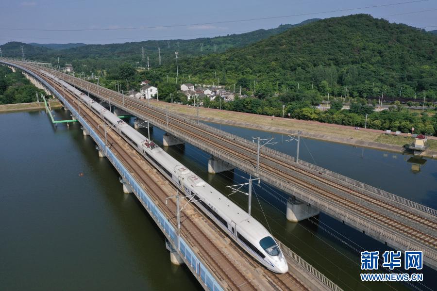 一列和諧號動車組列車駛經(jīng)京滬高速鐵路南京段(無人機(jī)照片,2020年6月30日攝)。新華社發(fā)(方東旭 攝)