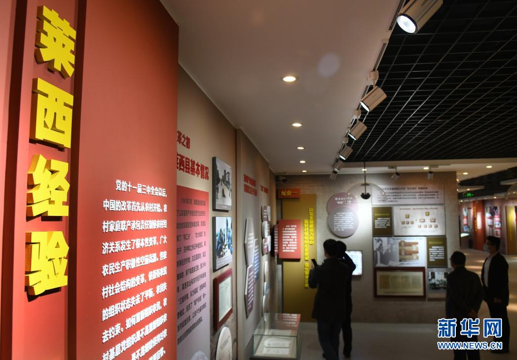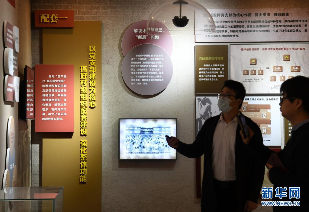 工作人員在“萊西會議專題展”上為觀眾講解村級組織建設(shè)“三配套”經(jīng)驗(3月25日攝)。新華社記者 李紫恒 攝