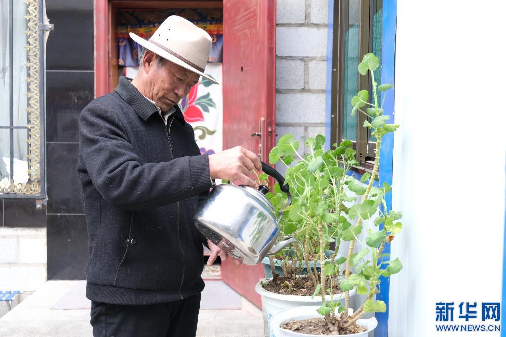 金珠給花澆水(3月26日攝)新華社記者格桑邊覺(jué) 攝