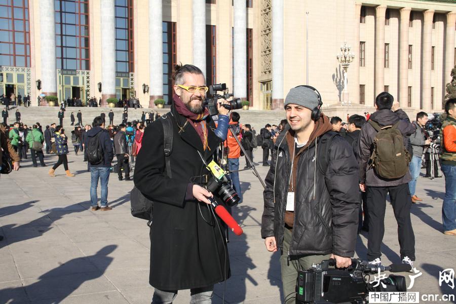 圖為兩位境外記者等待入場(chǎng)(央廣網(wǎng)發(fā) 時(shí)晨 攝)