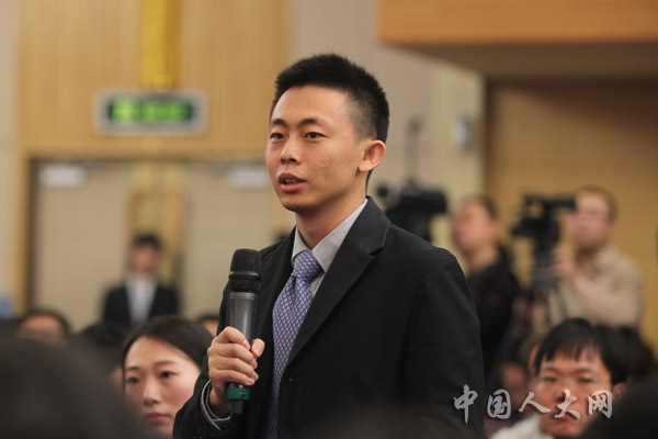 3月11日上午,十二屆全國人大二次會議在梅地亞中心舉行記者會,中國人民銀行行長周小川等五位嘉賓就“金融改革與發(fā)展”的相關(guān)問題回答中外記者的提問。圖為中央電視臺、中國網(wǎng)絡(luò)電視臺記者提問。羅榮 攝