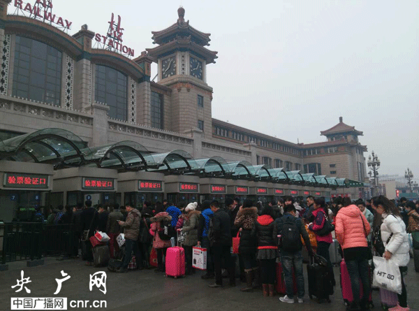 北京站回鄉(xiāng)旅客排隊檢票進站 路況有點兒堵
