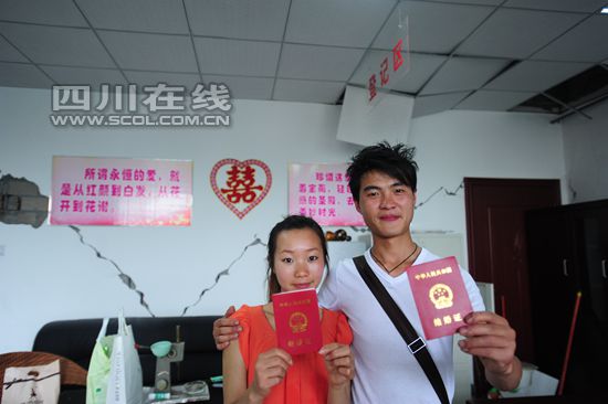 4月26日上午,小倆口跑到雅安市區(qū)照了相回來,當(dāng)天下午就鉆進(jìn)了蘆山縣民政局所在的帳篷。下午下班之前,兩人終于取到了結(jié)婚證,笑得合不攏嘴。在蘆山縣民政局供新人合照的紀(jì)念墻前,一條V字形的裂紋刻進(jìn)了兩人的相片。