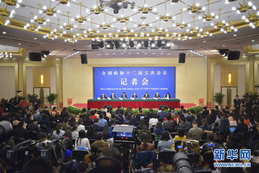 3月9日,全國政協(xié)十二屆五次會(huì)議舉行記者會(huì),邀請5位全國政協(xié)委員圍繞保障和改善民生的重點(diǎn)任務(wù),就精準(zhǔn)扶貧精準(zhǔn)脫貧、提高醫(yī)療公共服務(wù)水平、以創(chuàng)業(yè)帶動(dòng)就業(yè)、推進(jìn)養(yǎng)老服務(wù)、持續(xù)加強(qiáng)節(jié)能環(huán)保和生態(tài)建設(shè)等回答記者提問。圖為記者會(huì)現(xiàn)場。新華網(wǎng)/中國政府網(wǎng) 傅義洲 攝