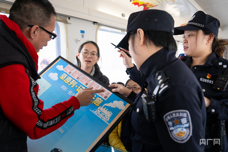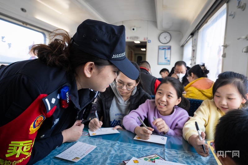 車(chē)廂一角,“馬年新春送!钡男∽狼,不少旅客排起了隊(duì)。乘警揮毫寫(xiě)下“!弊趾痛郝(lián),墨香在車(chē)廂里彌漫開(kāi)來(lái);另一側(cè),便民服務(wù)宣講點(diǎn)前,工作人員手把手教大家使用政務(wù)服務(wù)小程序,解答社保、戶籍等問(wèn)題。車(chē)廂里還布置了“記憶墻”,一張張老照片、一張張明信片,把四十多年的故事慢慢鋪展開(kāi)來(lái)。