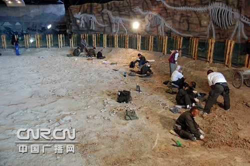 內(nèi)蒙古龍昊古生物研究所12研究人員在剛建成的龍化石埋藏館內(nèi)進(jìn)行保護(hù)性挖掘。