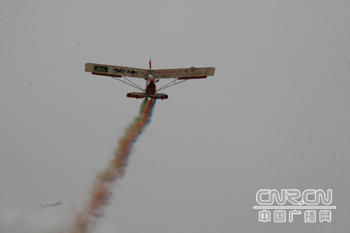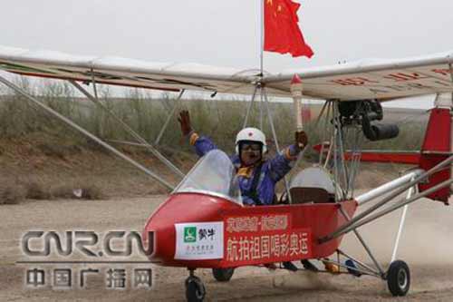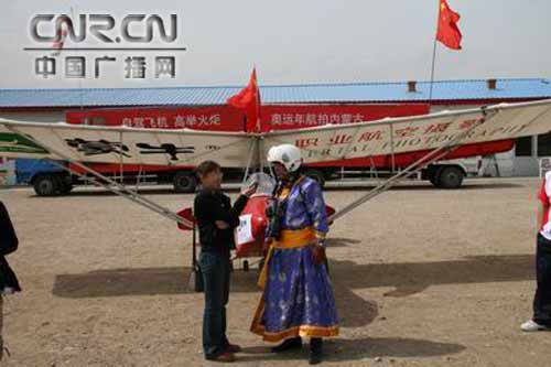 中廣網(wǎng)呼和浩特5月3日消息(記者鄭穎 攝影馬立峰)祝福北京、喝彩奧運(yùn),奧運(yùn)火炬手諾敏·何自駕飛機(jī)航拍內(nèi)蒙古起飛儀式今天下午兩點(diǎn)左右在和林格爾航空俱樂(lè)部舉行。起飛儀式上,諾敏·何身著蒙古族盛裝自駕飛機(jī)在空中進(jìn)行了航拍表演,用特別的方式表達(dá)一位蒙古族奧運(yùn)火炬手的奧運(yùn)情懷,寄托對(duì)北京奧運(yùn)會(huì)的祝福。
