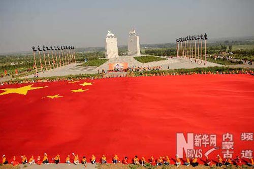 中廣網(wǎng)呼和浩特7月9日消息 7月9日北京奧運(yùn)圣火在內(nèi)蒙古自治區(qū)鄂爾多斯市傳遞,當(dāng)?shù)厝罕娫诔杉己孤糜尉皡^(qū)擺出長80米、寬55米的巨幅國旗,迎接奧運(yùn)圣火的到來。(任軍川)
