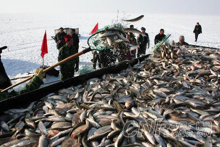 24日,是冬捕出魚的第一天,打眼、走桿、穿繩、下網(wǎng),在經(jīng)過捕魚工人一上午的忙碌后,下午一點(diǎn)多鐘,分布在湖區(qū)不同區(qū)位的三張400多米的沉重大網(wǎng)在拉網(wǎng)機(jī)的牽引下相繼被緩慢的拖上冰面。在一隊(duì)出網(wǎng)口,筆者有幸觀看了出魚的全過程:網(wǎng)內(nèi)的魚兒噼啪亂撞,隨著網(wǎng)口的拉開,一條條銀白色的華子魚和黑灰色的鯽魚不時(shí)躍出,或是翻回到網(wǎng)內(nèi),或是摔在冰面上......該隊(duì)蒙隊(duì)長拿一根長長的桿子往網(wǎng)中一探,高興得對(duì)大家說:“紅網(wǎng),這一定是紅網(wǎng)。”據(jù)捕魚工人講,一般夠上2萬斤的就稱為紅網(wǎng),像這樣的情況在前幾年并不多見,要是頭一天打魚就遇上紅網(wǎng)就更難得了。一位捕魚工人一邊往車上裝魚,一邊興奮地說:“今天太高興了,頭一天就打個(gè)紅網(wǎng),這預(yù)示著我們今年又是一個(gè)豐收年!彼樖肿テ鹨粭l華子魚說:“你看,今年的魚個(gè)又大又勻稱,看來還是環(huán)境保護(hù)、養(yǎng)殖增值效益高啊!”下午4點(diǎn)多鐘,捕魚工人們迎著凜冽的寒風(fēng),隨著拉魚的拖車,一路歡笑,滿載而歸。