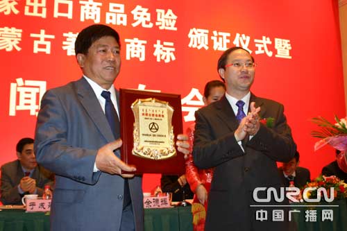 內蒙古自治區(qū)副主席余德輝向眾環(huán)集團頒發(fā)“出口商品免驗證書”