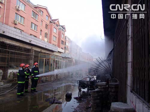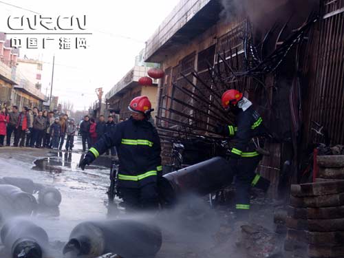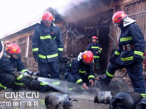 經(jīng)現(xiàn)場勘察后,指揮員果斷決定將官兵分成兩個小組展開戰(zhàn)斗,第一小組設(shè)立警戒區(qū),防止圍觀群眾進入現(xiàn)場;同時用稀釋空氣中的液化氣體,防止液化氣向周圍居民區(qū)擴散;第二小組撲救液化氣站內(nèi)火災(zāi)。兩個戰(zhàn)斗小組接到命令后迅速行動,第一戰(zhàn)斗小組利用開花水槍稀釋空氣中不斷向居民區(qū)蔓延的液化氣體。為預(yù)防再次發(fā)生爆炸事故,第二戰(zhàn)斗小組爬上了液化氣站對面房頂占據(jù)有利位置射水撲救火災(zāi)。經(jīng)過大約20分鐘的戰(zhàn)斗,大火被基本撲滅。在水槍的掩護下,消防官兵奮不顧身地沖進房屋內(nèi),冒著隨時可能發(fā)生爆炸的危險,將熱得發(fā)燙的液化氣罐搬出。隨后,官兵們用水槍繼續(xù)對罐體射水冷卻,防止發(fā)生爆炸。在搬運液化氣罐的時候,官兵們發(fā)現(xiàn)還有一個液化氣罐在不停的泄露,由于罐體抓手部分變形積壓住閥門部分,給官兵們處置帶來較大的困難。在水槍的稀釋下,官兵們用鉗子將閥門擰死,止住了氣體的泄露。經(jīng)過1個多小時的奮戰(zhàn),官兵們終于將此次事故成功處置,避免了造成更大的事故。