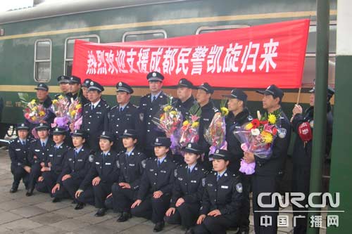 中廣網(wǎng)呼和浩特3月10日消息(記者鄭穎 通訊員張強(qiáng)、崔玉平)2008年3月9日11時(shí)30分,隨著載著呼鐵公安局包頭公安處支援成都春運(yùn)工作民警的1718次列車(chē)?吭诎^東站,一剎那,鮮花和榮譽(yù)屬于這些凱旋歸來(lái)的鐵警英雄們,包頭鐵路公安處領(lǐng)導(dǎo)帶隊(duì)來(lái)車(chē)站迎接他們的歸來(lái),標(biāo)志著支援成都春運(yùn)工作一個(gè)多月的包頭鐵路公安處20名民警圓滿(mǎn)完成工作任務(wù),凱旋歸來(lái)。