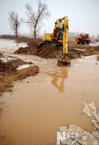 3月20日,在獨(dú)貴塔拉鎮(zhèn)解放一社,工程機(jī)械正在疏導(dǎo)洪水
