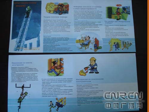 滿洲里市消防特勤大隊(duì)印制的俄文版消防宣傳單內(nèi)容包括如何報(bào)火警、火場(chǎng)逃生、滅火器使用方法和防火常識(shí)等消防安全知識(shí)。在宣傳單上還配有消防宣傳漫畫(huà),做到了圖文并茂,很受俄羅斯游客的喜愛(ài)。主要通過(guò)組織官兵直接向俄羅斯人發(fā)放和在俄羅斯人較為集中的賓館、飯店、西餐廳、商場(chǎng)、市場(chǎng)的醒目位置放置“俄文消防宣傳單”兩個(gè)渠道向俄羅斯入境人員宣傳消防知識(shí),達(dá)到了消防宣傳的作用和目的,到目前“俄文消防宣傳單”已發(fā)放5000余份。