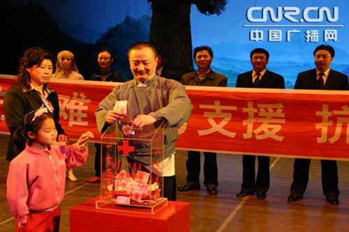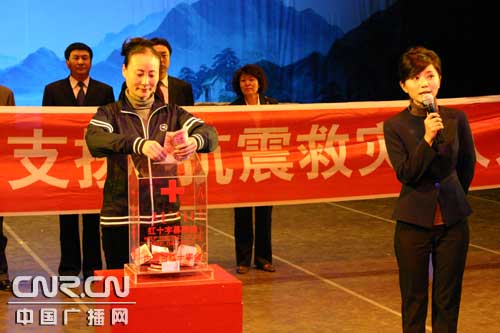 正式的捐款儀式在演出中場開始,演員們放棄了休息時間,為四川災(zāi)區(qū)籌集善款。現(xiàn)場觀眾也再次為四川災(zāi)區(qū)施以援手,有很多捐款的觀眾都讓自己的孩子親手將善款放進(jìn)“ 愛心箱”,她們說,“帶孩子來看芭蕾舞是為讓她們受到藝術(shù)的熏陶,但更應(yīng)該讓孩子有一顆懂得愛的心!币晃恍∨笥褜χ捦灿弥赡鄣穆曇粽f:“那里的小朋友正可憐,都被壓在房子下面了!