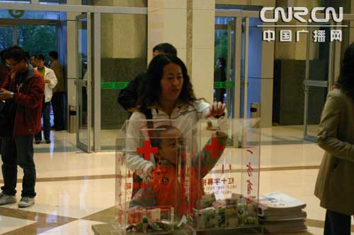 記者到場時,發(fā)現(xiàn)在門廳已設(shè)立了捐款箱,剛檢完票準(zhǔn)備入場的觀眾看到捐款箱后紛紛獻(xiàn)出愛心。