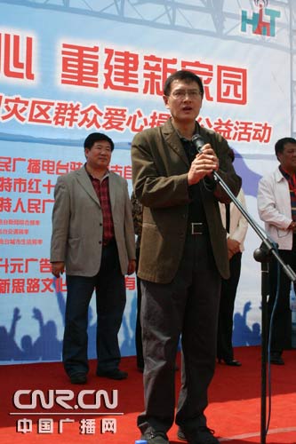 中廣網(wǎng)呼和浩特5月16日消息(記者陳青平、文偉)5月16日上午10:00,由中央人民廣播電臺內(nèi)蒙古記者站、呼和浩特市紅十字會、呼和浩特人民廣播電臺共同發(fā)起的“攜手獻愛心 重建新家園”——關(guān)愛四川災(zāi)區(qū)群眾愛心捐贈公益活動在呼和浩特市新華廣場舉行。截至記者發(fā)稿,共籌得善款432920.9元。其中中國移動呼和浩特分公司捐款10萬元。