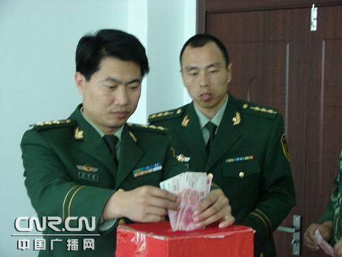 士官劉先飛家住四川青川地震災(zāi)區(qū),"5.12"地震發(fā)生后,該同志連續(xù)多天未能與家人取得聯(lián)系,給該同志的內(nèi)心帶來沉痛的打擊。5月18日,通過多方努力與家人取得聯(lián)系后,得知家人平安,房屋全部倒塌。為幫助戰(zhàn)友家庭重建家園,度過難關(guān),阿榮旗大隊(duì)黨委倡議全體官兵為戰(zhàn)友伸出援助之手,獻(xiàn)出一片愛心。倡議發(fā)起后,全體官兵積極響應(yīng),慷慨解囊,大隊(duì)領(lǐng)導(dǎo)帶頭捐款,官兵們紛紛伸出援助之手,積極捐款。在短短的幾分鐘時(shí)間內(nèi),籌到戰(zhàn)友愛心捐款3500余元。本次捐款大隊(duì)黨委高度重視,并將捐款親自交給劉先飛同志,雖然捐款數(shù)目不多,但卻代表全體官兵的一片愛心。