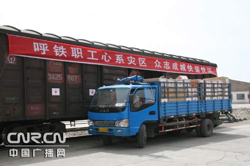 中廣網(wǎng)呼和浩特5月21日消息(記者那森寶音 攝影馬立峰)內(nèi)蒙古首批支援甘肅地震災區(qū)救援物資專列今天上午十時半啟運,開往甘肅天水。救援物資包括2萬件衣物、1057萬套棉被。