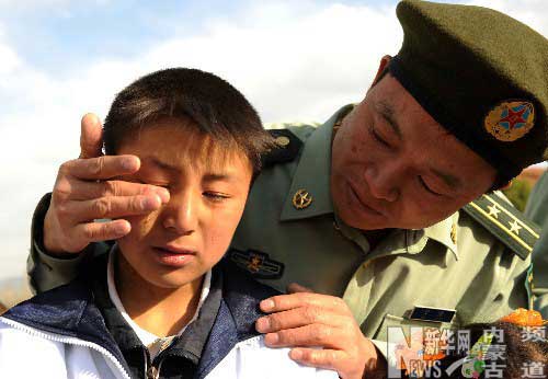 一名軍人在捐助儀式上為四川省地震災(zāi)區(qū)青川縣的小學(xué)生田云峰擦去淚水