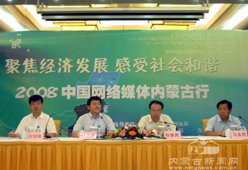 | 中廣網(wǎng)呼和浩特9月4日消息 2008年9月3日,由國務(wù)院新聞辦網(wǎng)絡(luò)局指導,內(nèi)蒙古自治區(qū)黨委宣傳部、自治區(qū)黨委外宣辦、自治區(qū)經(jīng)濟委員會、自治區(qū)旅游局主辦,內(nèi)蒙古互聯(lián)網(wǎng)新聞中心、呼和浩特市市委宣傳部、鄂爾多斯市市委宣傳部、烏海市市委宣傳部承辦的“聚焦經(jīng)濟發(fā)展感受社會和諧”第三屆中國網(wǎng)絡(luò)媒體內(nèi)蒙古行大型宣傳采訪活動在呼和浩特正式啟動,來自全國各地的近40家網(wǎng)絡(luò)媒體編輯記者齊聚首府,將對內(nèi)蒙古進行全面報道,采訪團成員將深入呼和浩特市、鄂爾多斯市、烏海市,對三市的三大產(chǎn)業(yè)進行深入采訪,著重報道改革開發(fā)30年來內(nèi)蒙古經(jīng)濟社會各領(lǐng)域取得的累累碩果,感受改革開放30年來內(nèi)蒙古經(jīng)濟快速發(fā)展給內(nèi)蒙古人民帶來的福祉,感受和諧社會里人民安居樂業(yè),生活欣欣向榮的美好景象。