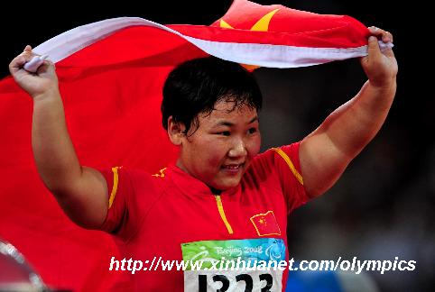 9月13日,在國家體育場進(jìn)行的北京2008年殘奧會女子鐵餅F40級決賽中,孟根吉米素以28米04的成績奪冠,并打破世界紀(jì)錄。 蒙古族姑娘孟根吉米素的奪冠讓人感到欽佩。年僅17歲的孟根吉米素天生患有生長激素缺乏癥。出生沒多久媽媽就出走了,由于爸爸常年在外打工,家里只有奶奶一個親人,小小的她從幼年時便分擔(dān)起家里的活計,生活的磨礪得到了造就了她堅韌的性格,所以我們向她送去了鮮花。