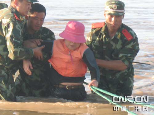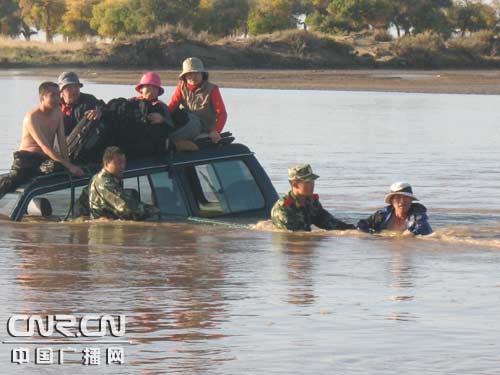當(dāng)日16時(shí)36分,額濟(jì)納旗邊防大隊(duì)接到報(bào)警稱:一輛越野車在距達(dá)來(lái)庫(kù)布鎮(zhèn)西南方向20公里的漫水橋被河水沖下橋面,車內(nèi)5人被困,情況危急,請(qǐng)求救援。接警后,邊防大隊(duì)立即啟動(dòng)處置突發(fā)事件預(yù)案,11名官兵攜帶繩索、鐵鍬等救援工具,兵分兩路火速趕赴漫水橋。事發(fā)現(xiàn)場(chǎng),百余名游客及過(guò)往群眾站在河水兩岸焦急而又無(wú)奈地向河中心張望、呼喊。一輛越野車被湍急的河水沖下橋面,距河岸150多米遠(yuǎn),河水已漫至車窗上沿,5名乘客坐在越野車頂部瑟瑟發(fā)抖,等待救援。由于近日額濟(jì)納旗境內(nèi)降雨量增大,漫水橋河面水位暴漲,水流湍急,越野車隨著水浪左右搖擺,隨時(shí)有被掀翻的危險(xiǎn),5名游客的生命岌岌可危。救援人員兵分兩組,身材較為高大的一組將繩索系住腰部,手挽手下河救援;另一組緊緊拉住繩索,確保救援官兵和被救群眾的安全。由于驚嚇過(guò)度兩名女游客,蜷縮在越野車頂部,驚恐地看著河水,不肯配合救援。經(jīng)過(guò)救助官兵在冰冷的河水中耐心勸導(dǎo),兩名女游客最終才接受救助。經(jīng)過(guò)一個(gè)小時(shí)的緊急救援,5名被困人員在河水漫過(guò)車頂之前全部被安全救出。經(jīng)了解,5名受困人員中4名是來(lái)額濟(jì)納旗旅游的韓國(guó)人,駕駛員系呼和浩特市某旅游局職工。5人在怪樹(shù)林拍照返回途中,由于駕駛員對(duì)漫水橋面情況不熟悉、對(duì)水勢(shì)估計(jì)不足,導(dǎo)致車輛被河水沖下橋面,險(xiǎn)些釀成車毀人亡的慘劇。