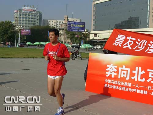 據了解,任衛(wèi)東要用五天多的時間從呼和浩特跑到北京,沿110國道途經集寧、大同、張家口等城市,這一壯舉為國內首次。到達北京后,僅休息一天,就參加2008北京國際馬拉松賽,對他來說的確是一次超越極限挑戰(zhàn)自我的嘗試。