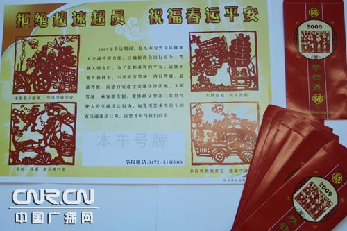 中廣網(wǎng)呼和浩特1月19日消息(記者鄭穎 通訊員單煒、姜雅靜)自1月11日2009年春運(yùn)開始,在包頭市的各長(zhǎng)途客運(yùn)站的駕駛?cè)撕偷群虺塑嚮丶疫^年的乘客們都收到了一份特殊的禮物——“紅包”,這是包頭市公安局交警支隊(duì)自行制作的2009年春運(yùn)交通安全宣傳品。這份宣傳品與往年不同,選用了節(jié)日期間人們常用的“紅包”,“紅包”的封皮上運(yùn)用了以警民和諧為主題的剪紙作品,一句“平安是!备堑莱隽舜哼\(yùn)交通安全的主題。不過與傳統(tǒng)“紅包”有所不同的是,這個(gè)“紅包”里裝的不是金錢,而是“平安”,是包頭市交警支隊(duì)寫給每一位機(jī)動(dòng)車駕駛?cè)撕统丝偷囊环庑牛審V大交通參與者在接受交通安全教育的同時(shí),也接受了“順利啟程、平安歸來(lái)”的美好祝愿。拿到“紅包”后,客運(yùn)車駕駛?cè)撕统丝蛡兊哪樕隙佳笠缰腋5臍g笑,他們高興地說(shuō):“的確是這樣,對(duì)于我們出門在外的人來(lái)說(shuō),能平安回家那就是最大的福氣!