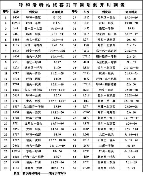 在原運行圖的基礎(chǔ)上,有38趟列車的運行時刻、車次等發(fā)生變化,其中原圖呼和—東勝的N293次,調(diào)圖后車次變更為K7903/4次;原圖包頭—北京西的1186次,調(diào)圖后車次變更為K886/5次,運行區(qū)間延長為:銀川—北京西;原圖呼和—烏海西的N281次,調(diào)圖后車次變更為K7905/6次。包頭—海拉爾隔日運行哈爾濱的1816次列車,終到站調(diào)整為哈爾濱,不再運行至海拉爾,運行時刻比舊運行圖推后2小時56分鐘,到達呼和時間:12:49,開車時間:13:01,停站時間延長4分鐘,終到哈爾濱時間:14:57分,沿途停靠正鑲白旗、桑根達萊、林西、大板、通遼、四平、長春、德惠等站。K598次列車運行時刻比原時刻提前44分鐘到達呼和站,停站時間縮短4分鐘。