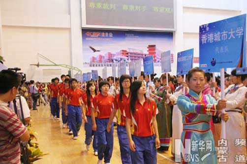 7月29日,香港城市大學(xué)代表隊在第十五屆全國大學(xué)生乒乓球錦標(biāo)賽開幕式上入場。