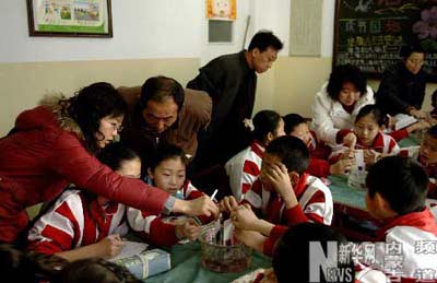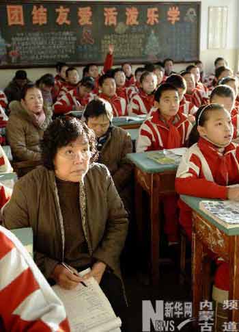 中廣網(wǎng)呼和浩特12月11日消息 12月9日,一位老教師(前左)在呼和浩特市貝爾路小學(xué)觀摩聽(tīng)課。教學(xué)開(kāi)放日不僅吸引了年輕教師參加,也有許多老教師前來(lái)觀摩。 呼和浩特市教育系統(tǒng)為提高全市900多所中小學(xué)和幼兒園的教學(xué)質(zhì)量,開(kāi)展了“校園教學(xué)開(kāi)放日”活動(dòng)。每周六選擇四所市內(nèi)教學(xué)質(zhì)量好的中學(xué)和幼兒園開(kāi)展教學(xué)觀摩活動(dòng),為城鄉(xiāng)學(xué)校的教師提供觀摩交流的平臺(tái),促進(jìn)教學(xué)質(zhì)量提高;顒(dòng)開(kāi)展9次以來(lái),先后吸引了1.2萬(wàn)余名教師參加。 新華社記者 于洋 攝