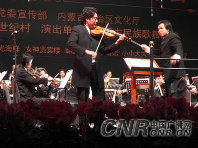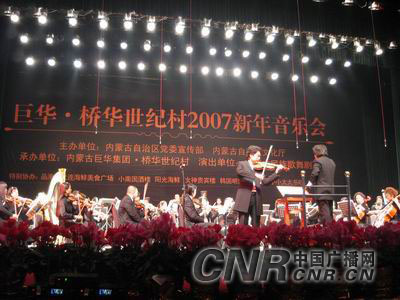 中廣網(wǎng)呼和浩特1月7日消息(記者鄭穎、劉俊霞) 1月6日晚在內(nèi)蒙古政府禮堂“巨華 橋華世紀(jì)村2007年新年音樂(lè)會(huì)”成功舉辦。國(guó)際著名指揮家姜金一先生、國(guó)際著名小提琴演奏家呂思清先生攜手內(nèi)蒙古民族歌舞劇院民族交響樂(lè)團(tuán)為青城觀眾獻(xiàn)上了一道豐盛的音樂(lè)大餐!