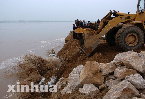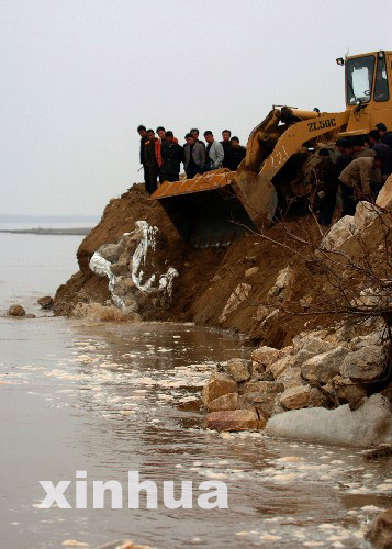 3月22日,搶險(xiǎn)人員正在加厚發(fā)生險(xiǎn)情的黃河堤壩。3月21日下午,黃河內(nèi)蒙古準(zhǔn)格爾旗李三壕河段出現(xiàn)流凌淘岸險(xiǎn)情。當(dāng)?shù)胤姥床块T動(dòng)用260多人和140余輛汽車、工程車日夜搶險(xiǎn)。目前淘岸險(xiǎn)情得到初步控制。 新華社記者 任軍川攝